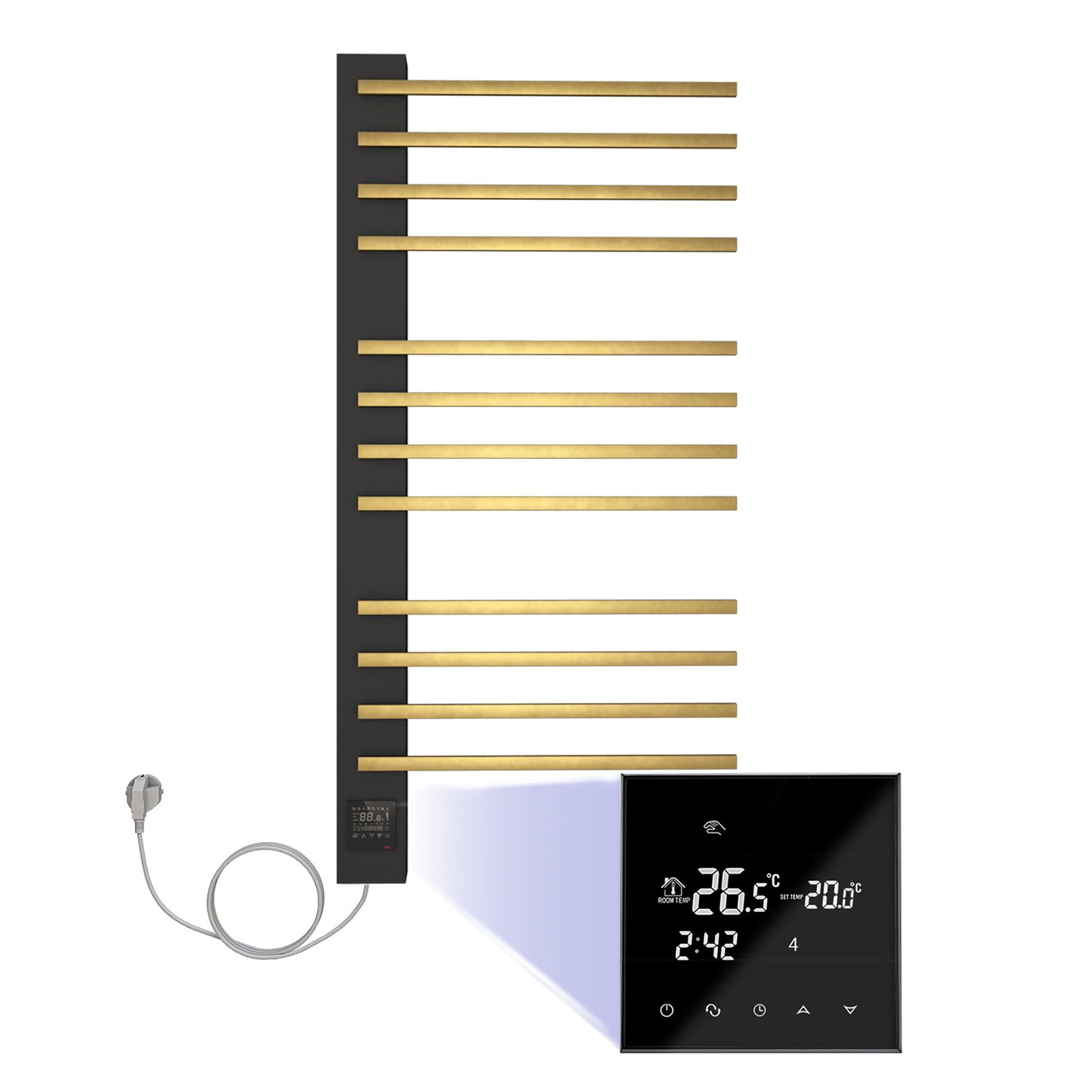 Sèche-Serviette Électrique, 140W Chauffe-Serviettes Mural 1120x600mm, Porte-Serviettes Chauffant Électrique avec Minuterie Thermostat Écran LED, Radiateur Salle de Bain, Noir et Or