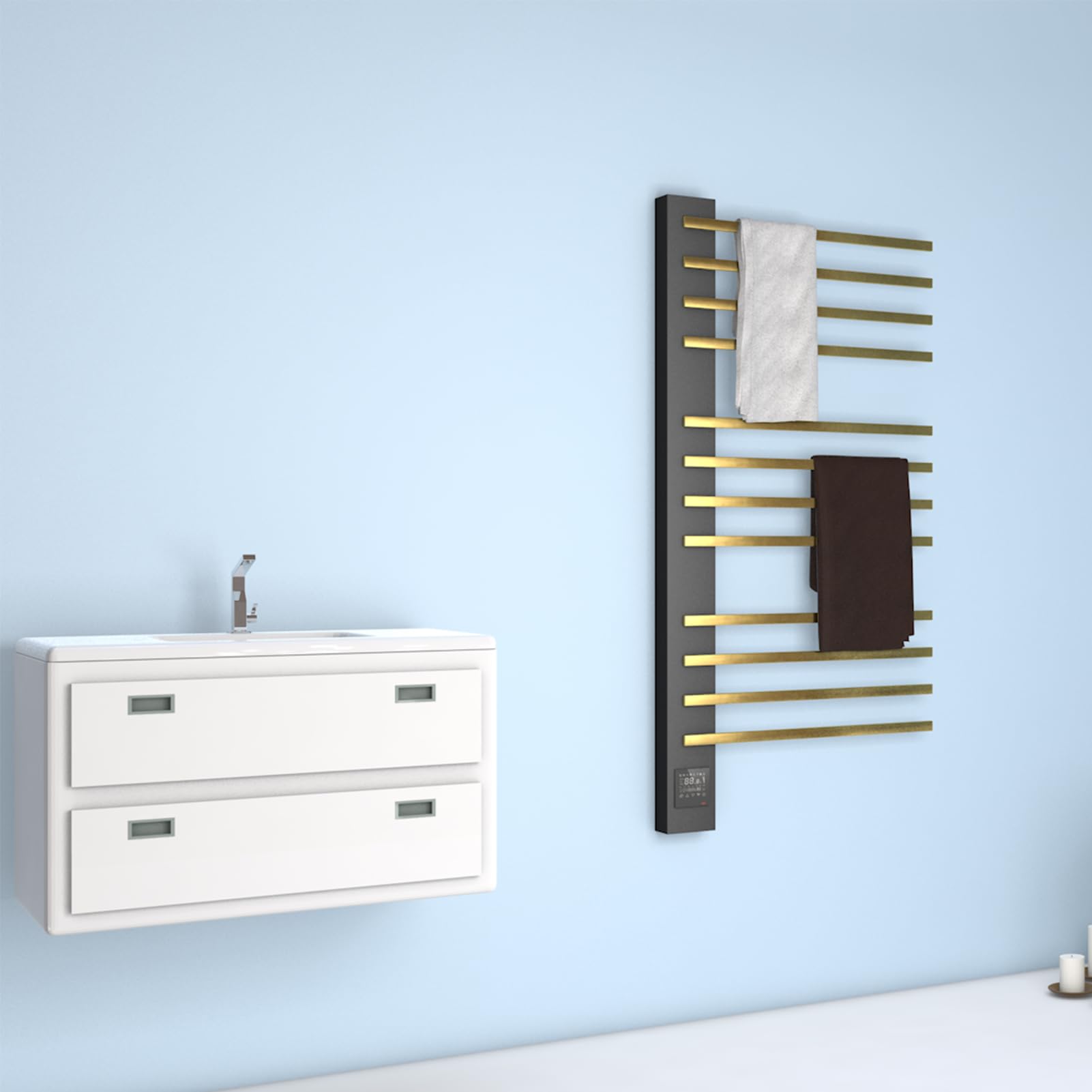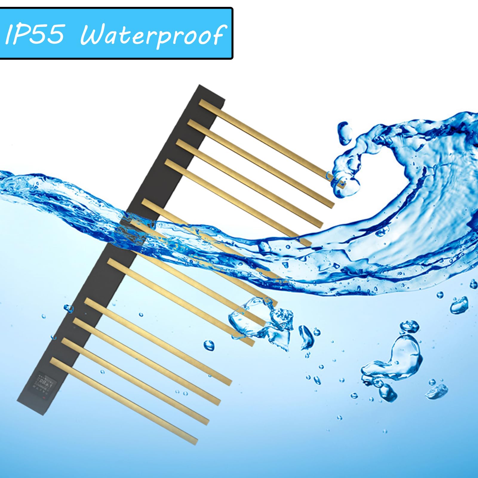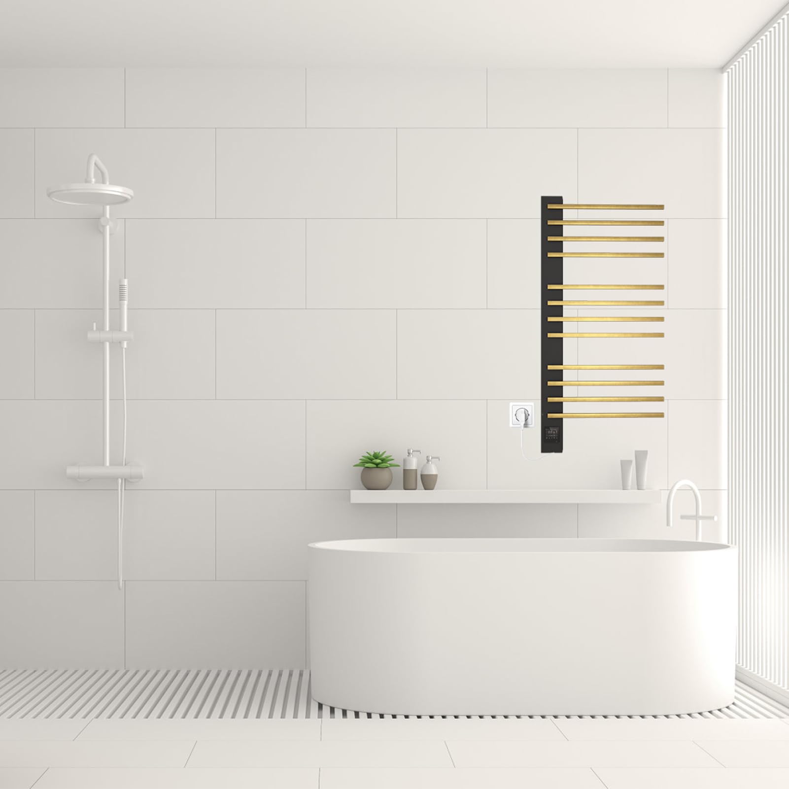 - Élégance Inégalée:Notre porte-serviettes électrique est conçu avec une attention aux détails et est disponible dans une captivante palette de couleurs noir et or. Sa finition noire élégante dégage un sentiment de modernité, tandis que les accents dorés brillants ajoutent une touche royale, créant un chef-d'œuvre visuel qui rehausse sans effort tout décor de salle de bain